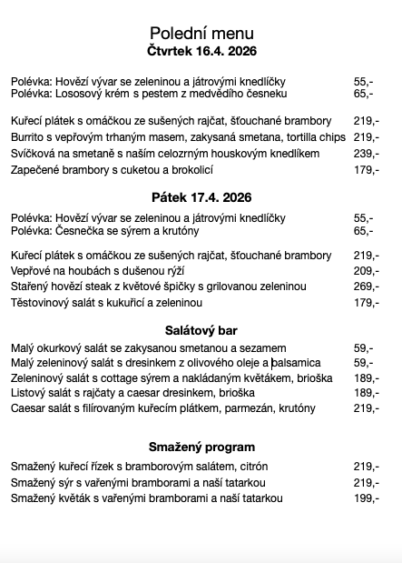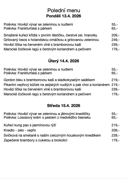 Každý týden pro vás připravujeme vyvážené obědové menu, které se mění každý den a doplňuje naši stálou nabídku. Vaříme z kvalitních lokálních surovin, s důrazem na čerstvost a poctivou domácí chuť.